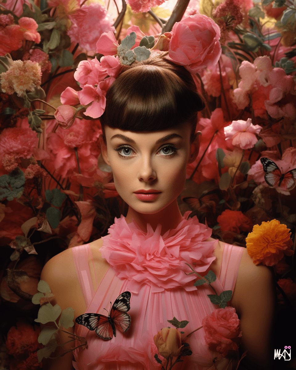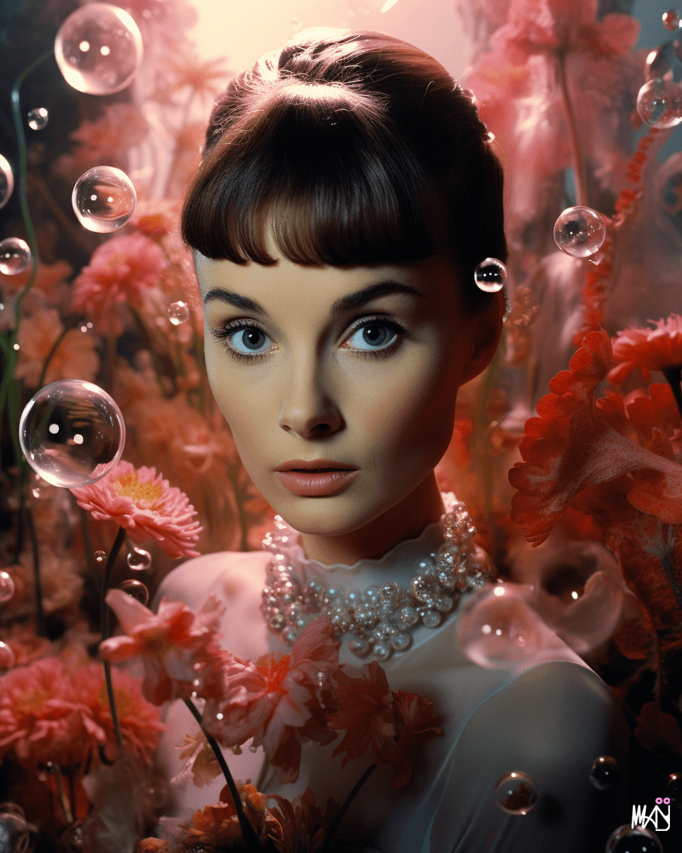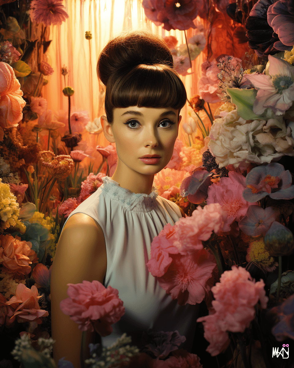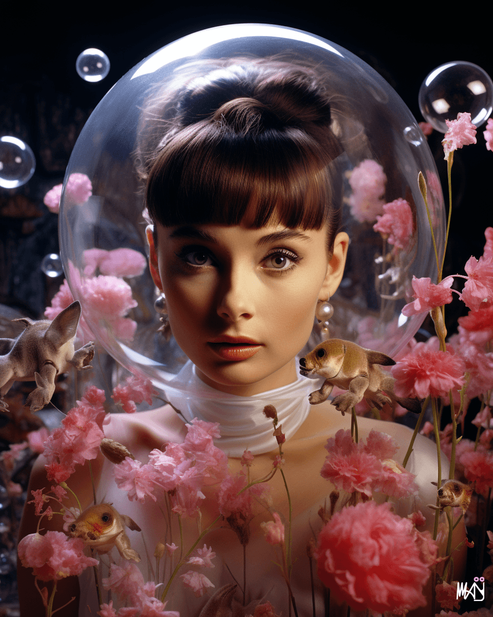 Criação de editorial lúdico usando Audrey Hepburn como personagem e simulando uma capa da Vogue.