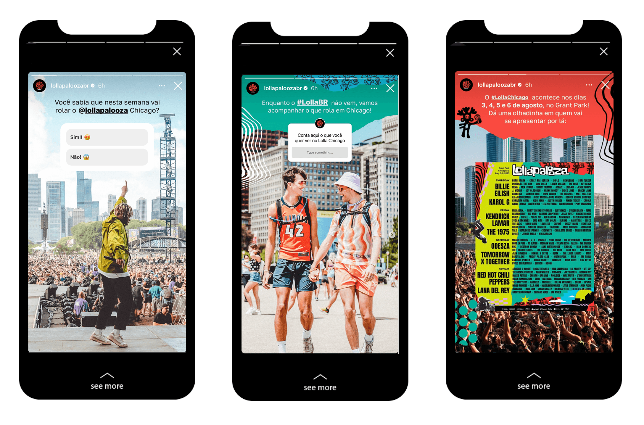 Além do Key Visual que foi direcional para todo o desdobramento, para a proposta visual do Instagram, em particular, trouxe uma estética lambe lambe, criando um contraste visual usando a paleta global do Lolla, de forma que fizesse alusão ao mural do festival. Levando em consideração que é o local mais instagramável do evento, fez todo o sentido trabalhar com esse elemento no formato 4x5 que também remete ao pôster.